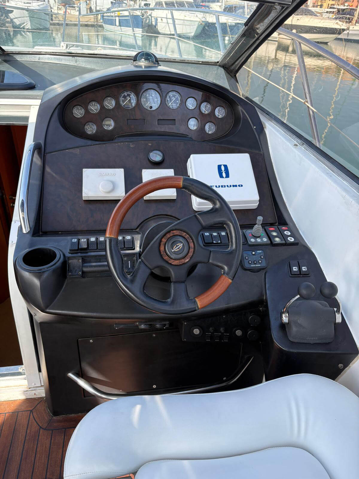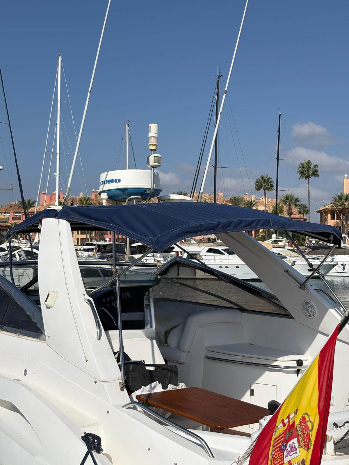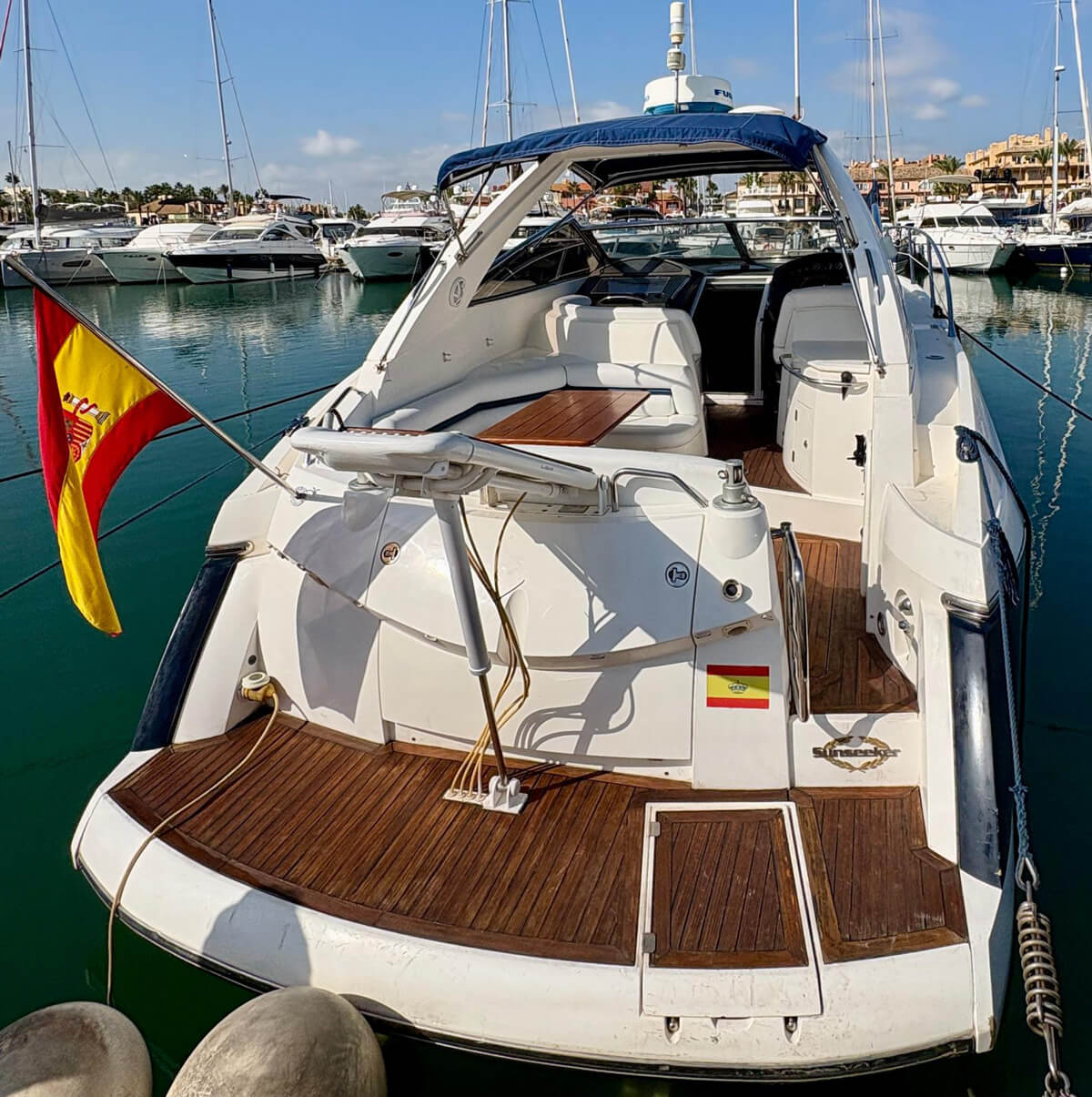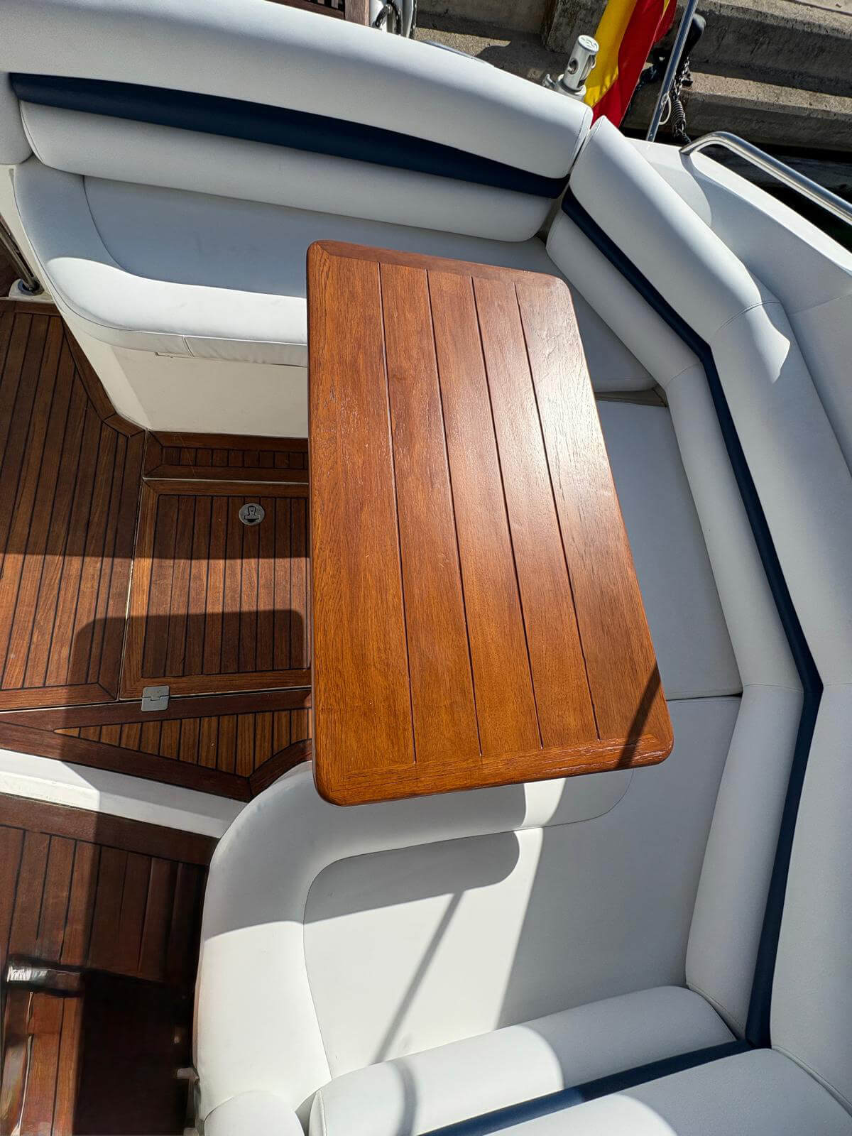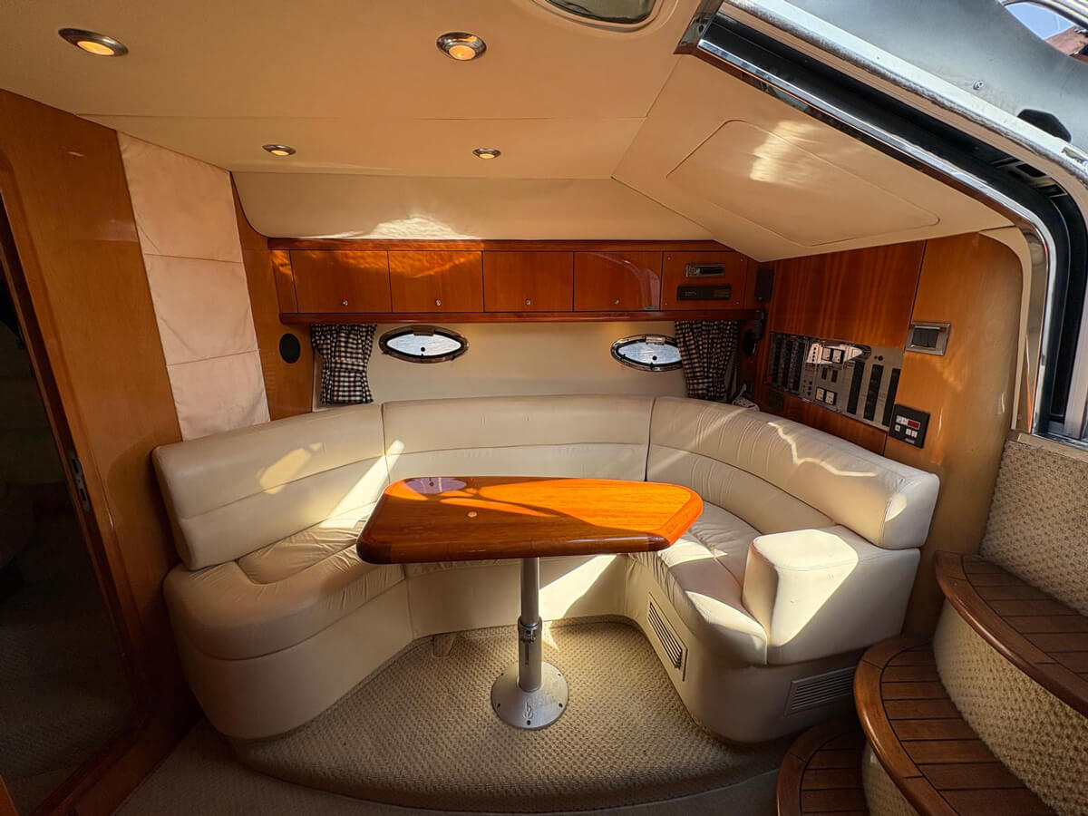 Este Sunseeker Portofino 35 de 2004, en perfecto estado, es un elegante yate a motor con dos motores Volvo KAD de 300 CV que ofrece un rendimiento espectacular y un manejo sencillo. Cuenta con piloto automático, radar, GPS y pasarela automática para un embarque cómodo. Entre sus comodidades se incluyen aire acondicionado, neveras interiores y exteriores, microondas, TV con reproductor de CD y transmisión eléctrica. El yate cuenta con bañera de teca, escalera de baño y molinete eléctrico con lona de invierno. Recientemente revisado por completo, con motores y casco revisados, ha superado la última inspección técnica de navegación (ITB). Listo para disfrutar de la navegación de inmediato.